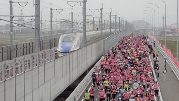 桜の名所や北陸新幹線との並走、恐竜の形をイメージしているコースの軌跡など福井を丸ごと体感できるコース設定と、魅力的な食のおもてなし、沿道のあたたかい応援が特長の大会です。
