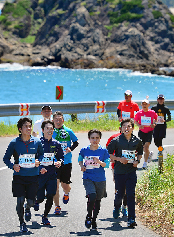 キャッチフレーズは「走るあなたが主役です!」。数万羽のウミネコと海岸線の絶景がお出迎え!雄大な太平洋を望む潮騒コースで心地よい走りを楽しむことができます。
