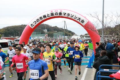 「世界の梅公園」など梅の名所の多いたつの市にて、早春開催される大会。のどかな田舎道と、潮の香りがただよう瀬戸内海の海岸線を走ります。スタート・フィニッシュ会場はたつの市御津運動場。兵庫県内唯一となる、国道(250号線)を往復10kmに渡って完全通行止めにしたコースを使用します。最大高低差は66m。