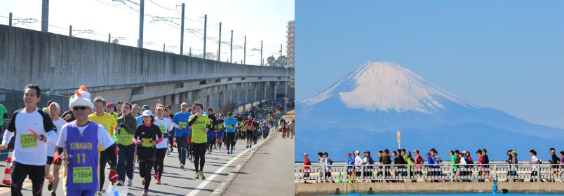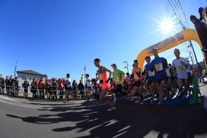 菜の花の咲く海岸沿いのフラワーラインを走るフルマラソン。前半はフラット、中盤以降アップダウンのあるコースです(最大高低差は約47m)。前日に金哲彦さんのマラソンクリニックあり(要別途申し込み・限定100人)。クリームパンのふるまいや資生堂ジャパン(株)提供の参加賞あり。「全国ランニング大会100撰」常連大会。「フルマラソン1歳刻みランキング」対象大会。「お城マラソン」参加大会。