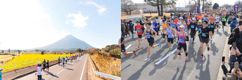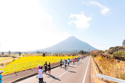 九州最大の湖・池田湖や、薩摩富士とも称される開聞岳などを眺めながら走るフルマラソン(公認コース)。例年、コース上には満開の菜の花が待っています。発着会場は指宿市営陸上競技場周辺。最大高低差は100m。「おもてなし日本一」を合言葉にした市民たちによる沿道の温かな応援、指宿名物の鰹の腹皮やさつまいもなどのエイド食、山川港名物の「茶節」などのふるまいあり。ゲストランナーは川内優輝さん、大会ゲストは瀬古利彦さん。「全国ランニング大会100撰」常連大会。「お城マラソン」参加大会。