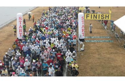 岐阜県海津市の木曽三川公園内アクアフィールドマラソンコースを舞台にしたレース。長良川横の河川敷に設定された、フラットな1周約10kmの周回コースを走ります。一般の交通から分離されマイペースで走れるコースのため、初心者でも安心して参加できます。エイドは私設エイドのみ。昨年の参加賞はタオル、大根など。