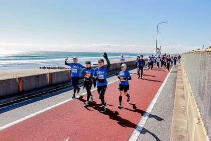 普段は走ることのできない有料道路「東金九十九里有料道路」と「九十九里有料道路(波乗り道路)」を走り、ジャンクションから太平洋の絶景を眺めながら走れるハーフマラソンです。バスターミナル、アリーナ、陸上競技場が一体となったストレスフリーな会場。ハーフでは特産のいちごが並ぶいちごステーション、フィニッシュ後の「家康鷹狩り汁」ふるまいあり。発着会場は東金アリーナ陸上競技場。ゲストは千葉真子さん(世界陸上メダリスト)、宮脇花綸さん(パリ五輪フェンシングメダリスト)、永田裕志さん(新日本プロレス所属)。「全国ランニング大会100撰」連続選出大会。