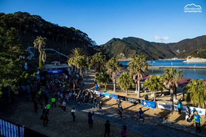 山と海に恵まれた三重県の大紀町が舞台のトレイルランレース。熊野灘やリアス式海岸、海跡湖の眺めを楽しめる日本随一のコースを走ります。発着会場は南国ムードたっぷりの錦向井ヶ浜遊パーク トロピカルガーデンのビーチ。姫越山の坂を上り切った頂上では、眼下にキラキラ光り輝く太平洋の絶景が待っています。累積標高は23kmの部が約1600m、14kmの部が約860m。
