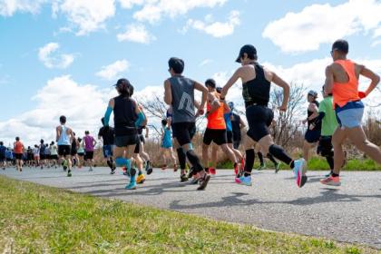鯖江市東公園陸上競技場をスタート・フィニッシュする、のどかな田園地帯を駆ける大会。例年つつじが満開を迎える時季、ハーフマラソンから、小学生以上が出られる2kmまでの計5種目で開催されます。初心者や自己ベスト更新を目指す人にもおすすめのフラットコース。計測はグロスタイム方式を採用。