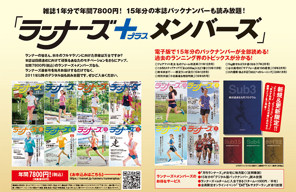 ランナーズ+(プラス)メンバーズは、ランニング最新情報(本誌)が毎月届くことはもちろん、2011年1月号以降の記事がデジタル版で読み放題(付録は除く)! さらに、毎週末開催している「TATTAサタデーラン走り放題」、上記豪華コーチ陣から毎週「目標達成チャレンジ(練習や課題)」が届く「+inチーム(+1000円/6カ月で入会可能)」など全サービス込みで年間7800円!」 超お得な「ランナーズ+(プラス)メンバーズ」入会をお待ちしています!