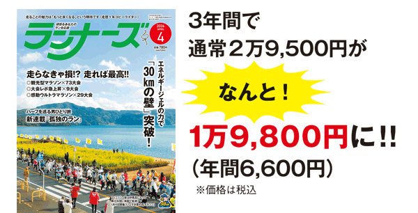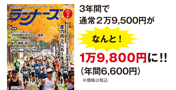 ランナーズ+(プラス)メンバーズは、ランニング最新情報(本誌)が毎月届くことはもちろん、2011年1月号以降の記事がデジタル版で読み放題(付録は除く)! さらに、毎週末開催している「TATTAサタデーラン走り放題」、デジタル冊子「絶対達成6カ月プログラム」提供など全サービス込みで年間7800円! 超お得な「ランナーズ+(プラス)メンバーズ」入会をお待ちしています!