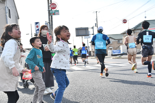 沿道には子どもやお年寄りの応援も多く、充実した私設エイドも次々に登場! 大都市マラソンとはまた違った近くて温かな距離感、応援から大いなるエネルギーがもらえるはず。