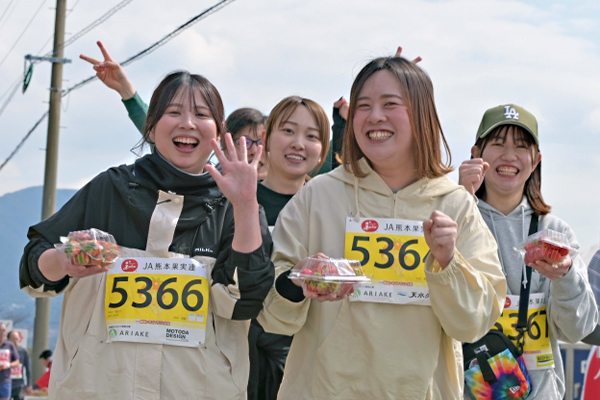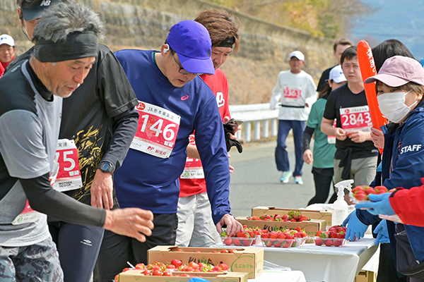 沿道で待っているのは、玉名市特産のいちご、ミニトマトが並ぶエイドステーション! そのみずみずしい美味しさと、沿道の皆さんの声援や笑顔が、選手たちを完走へと後押ししてくれます。