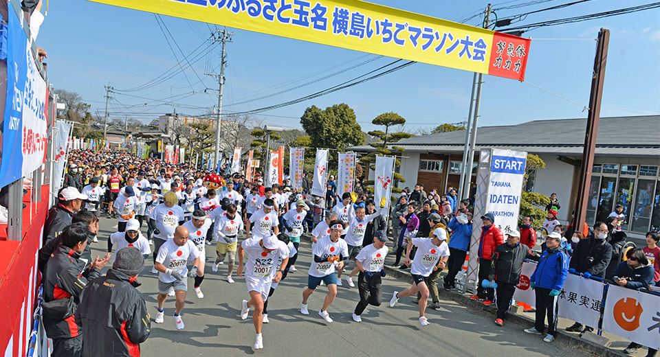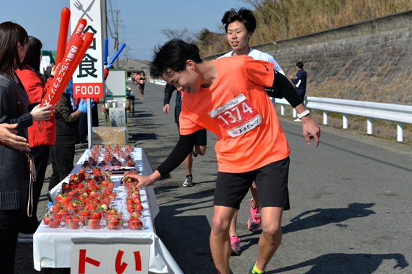 「横島いちごマラソン大会」は、ハーフマラソン以下、5つの種目から成る大会。いずれも、エイドでは地元特産の自慢のいちごやミニトマトが食べ放題! 大人から子どもまで楽しめるレースです。