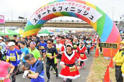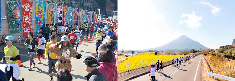 九州最大の湖・池田湖や、薩摩富士とも称される開聞岳などを眺めながら走るフルマラソン(公認コース)。例年、コース上には満開の菜の花が待っています。発着会場は指宿市営陸上競技場周辺。最大高低差は100m。「おもてなし日本一」を合言葉にした市民たちによる沿道の温かな応援、指宿名物の鰹の腹皮やさつまいもなどのエイド食、山川港名物の「茶節」などのふるまいあり。ゲストランナーは川内優輝さん、大会ゲストは瀬古利彦さん。「全国ランニング大会100撰」常連大会。「お城マラソン」参加大会。フルマラソンの制限時間はたっぷり8時間。