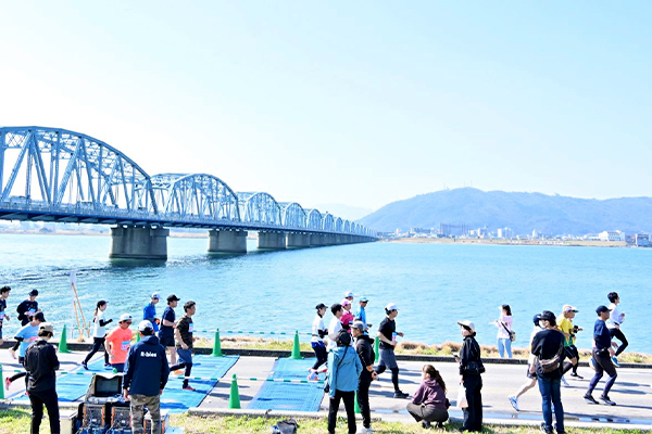 美しい吉野川の水面と、とくしまマラソンのシンボル「眉山」をはじめとする四国の山並み、菜の花の鮮やかな景色が目の前に広がる、全身で徳島の美しい春を感じられるコースです。