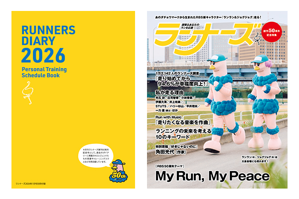 特別レポート「世界は今、空前のランニングブーム」も掲載。別冊付録のランナーズダイアリーも50周年特別版です。裏表紙には当社の創業50周年を記念した新キャラクター「ランラン」&「ジョグジョグ」が登場しています。