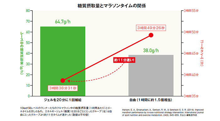 根拠の1つになるデータを1つ挙げます。海外の研究で、10kmのタイムが同レベル(45分40秒前後)のランナーを2つのグループに分け、片方のグループはマラソンで20分ごとにエネルギージェルを摂取、もう1つのグループは自由にしました(後者の糖質摂取量は前者の約6割)。その結果、ジェルを多く摂取したグループの平均タイムは3時間38分31秒と、摂取量が少ないグループより10分以上速くなっていたのです。