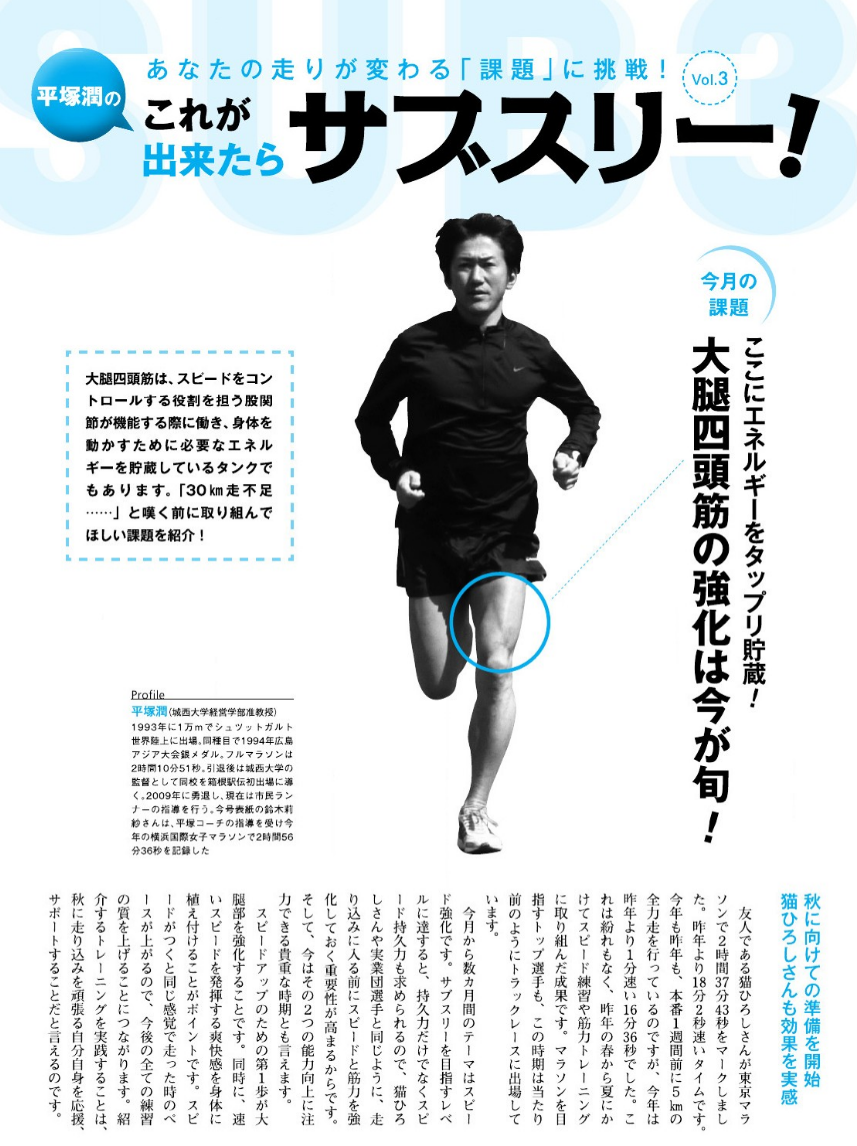 現在発売中のランナーズ5月号では、過去の本誌サブスリー連載から厳選した6人のコーチ陣による「サブスリー達成法」と「サブスリー論」を抜粋して再録しています。そのコーチ陣は喜多秀喜さん、角田進さん、伊東輝雄さん、金哲彦さん、吉岡利貢さん、平塚潤さん。ここでは、2011年4月号~12年3月号に掲載した平塚さんの連載から抜粋した「サブスリー論とサブスリー達成法」を紹介します。