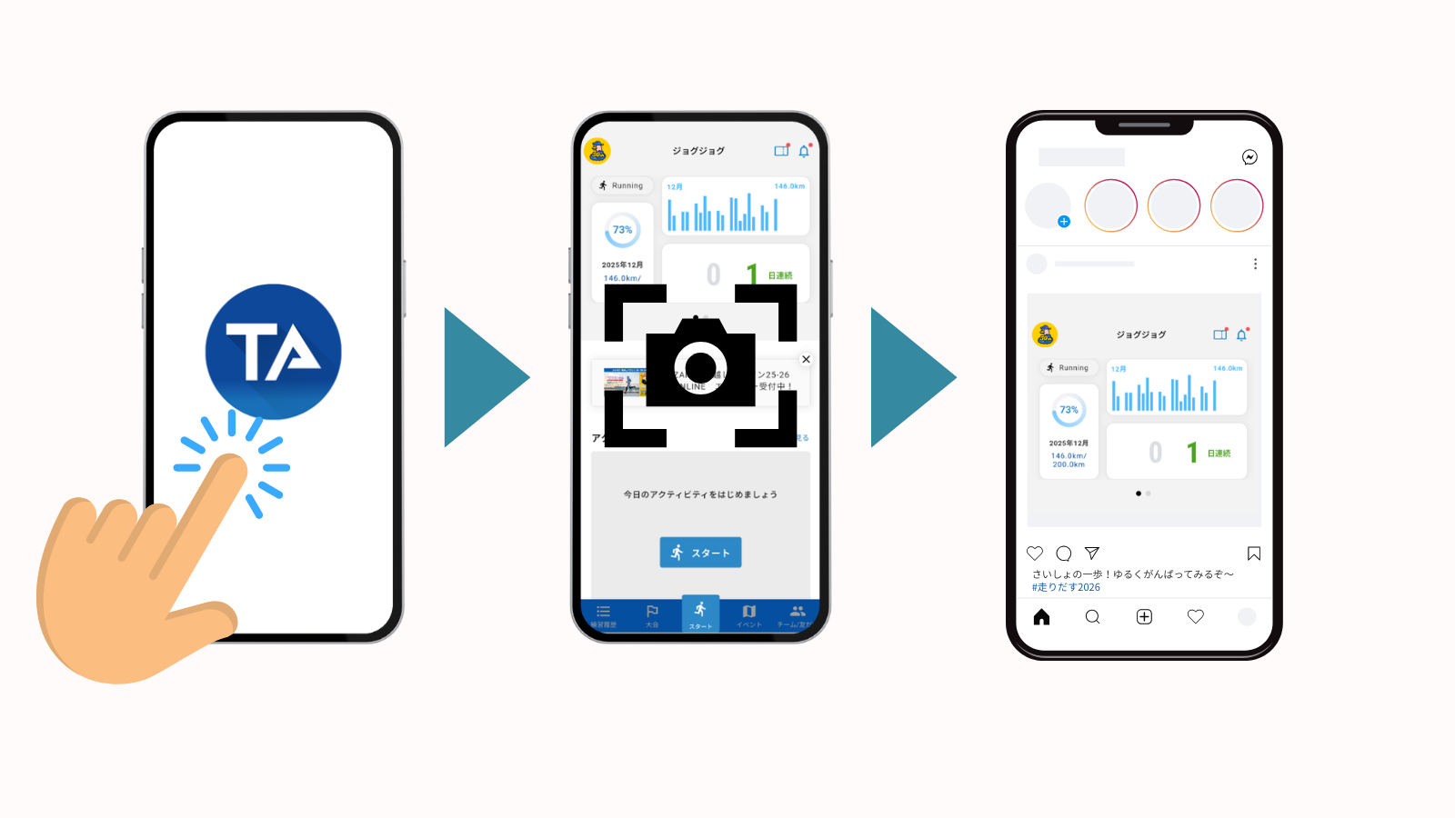 キャンペーン期間中に「TATTA」アプリの画面(走った後、歩いたことがわかる画面)の画像に「#走りだす2026」をつけて XまたはInstagramに投稿してください。